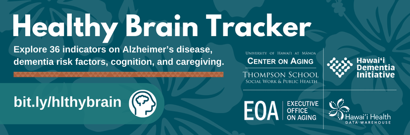 The newly released Healthy Brain Tracker contains valuable population data on Alzheimer’s Disease and Related Dementias (ADRD), dementia risk factors, cognition, and caregiving in Hawaiʻi. It was developed by the University of Hawaiʻi’s Thompson School of Social Work and Public Health’s Hawaiʻi Health Data Warehouse (HHDW) with the Center on Aging (COA) Building Our Largest Dementia Infrastructure (BOLD) team in partnership with the Executive Office on Aging (EOA).